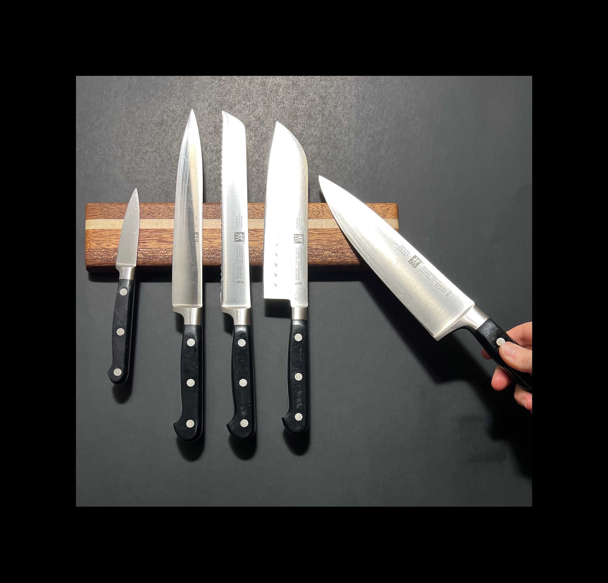 This 12" magnetic knife block hangs on the wall, creating a sleek and space-saving storage solution for your kitchen knives. With its strong magnetic surface, it securely holds your knives in place and keeps them within easy reach. Each knife block will vary in color and wood grain pattern because of its unique natural properties. They are all coated with a food grade oil finish and vary slightly in thickness but are all around 3/4" thick. Knife block roughly measures 12" X 2 1/2".